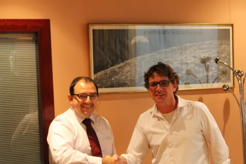 A la dreta de la imatge, Albano Sanchez-Ossorio, anterior degà del COETIC, i a l'esquerra el nou degà del Col·legi, Miquel Conesa i Pellicer.
