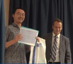 Imatge: Kaixi Luo Tao rep el Premi extraordinari de la titulació de Grau en Enginyeria Informàtica de mans d'Òscar Planes. Font: Universitat de Girona.