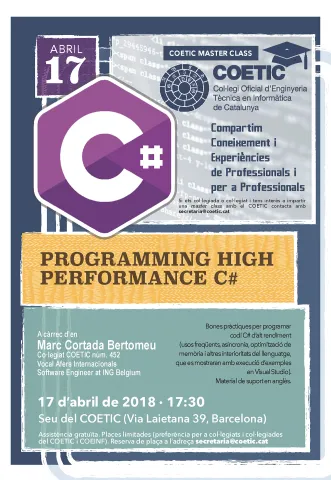 El COETIC organitza el proper dimarts 17 d'abril una xerrada sobre programació d'alt rendiment en llenguatge C#. La sessió tindrà lloc a la seu del col·legi (Via Laietana 39) i el ponent serà Marc Cortada, company nostre del col·legi i que desenvolupa tasques de Software Engineer a ING Belgium.