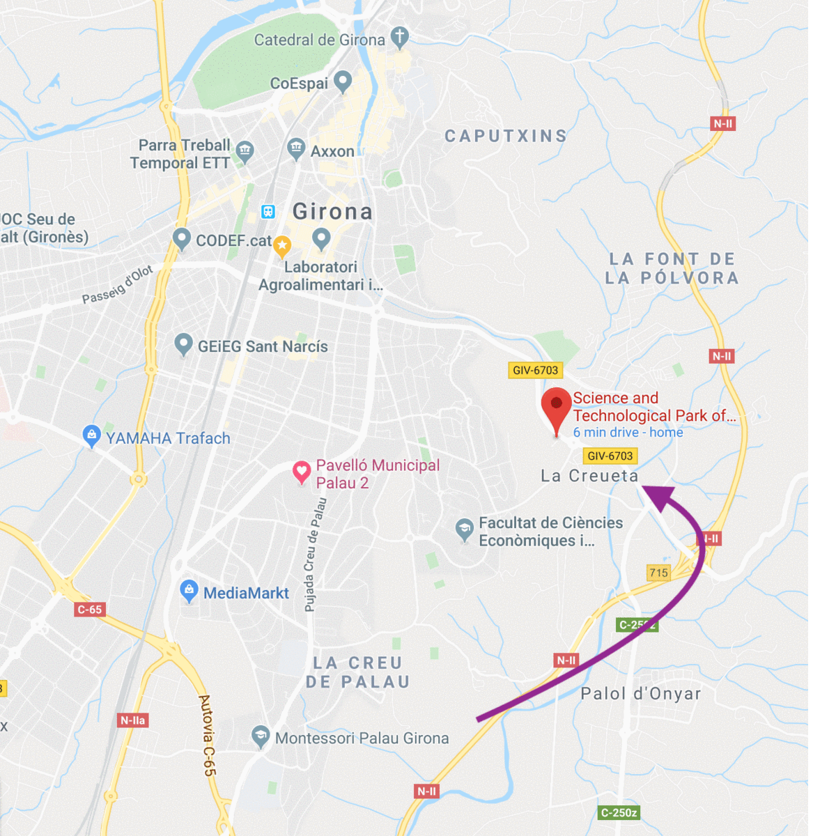 - Un cop agafada la sortida, anar en direcció Girona per la GIV-6703 uns 1.5 km fins a la rotonda del propi parc