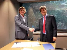 Xavier Bernadí, director general de Dret i d’Entitats Jurídiques del Departament de Justícia de la Generalitat de Catalunya, i Miquel Conesa, degà del Col·legi Oficial d’Enginyeria Tècnica i de Grau en Informàtica de Catalunya (COETIC), han signat un Conveni de Col·laboració en matèria de Mediació.